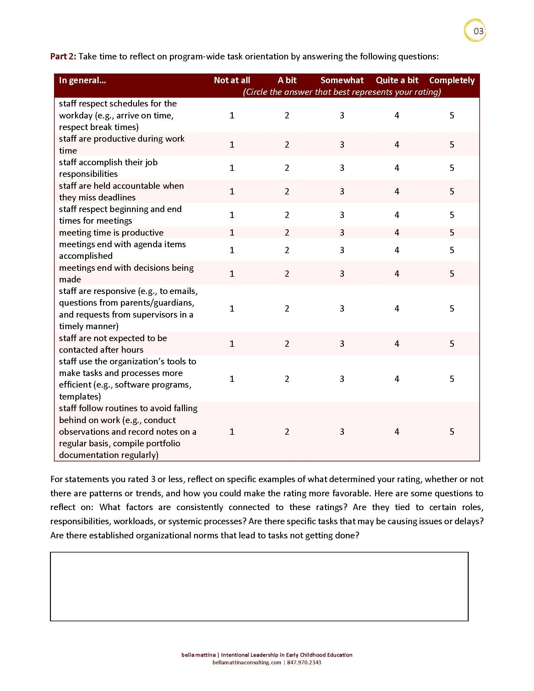 Is your early care and education program known for its efficiency? Are projects and tasks thoughtfully planned? Would staff describe the program as productive? Is procrastination an exception rather than a rule? Efficiency, planning, and productivity are all qualities that make task orientation a powerful asset. When meetings start and end on time, projects move forward with ease, deadlines are met, and outcomes are achieved, staff tend to experience more satisfaction than when the opposite occurs. Staff perceptions about task orientation shape how they feel about their workplace and influence the organizational climate of the program.