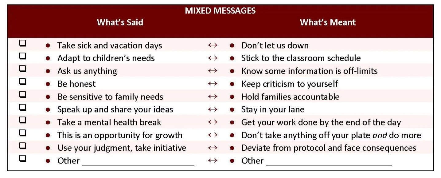 These conflicting messages cause more than stress. They can also be a source of guilt and bad decisions. Leaders need to be clear about what they want from staff, and that what they want aligns with what they tell staff to do. Hopefully, leaders say what they mean. However, the following list contains examples of common mixed messages. Take a moment to review the list, identifying mixed messages that are currently communicated. Keep in mind, more than verbal communication may be used to convey the messages below to staff.